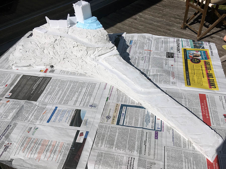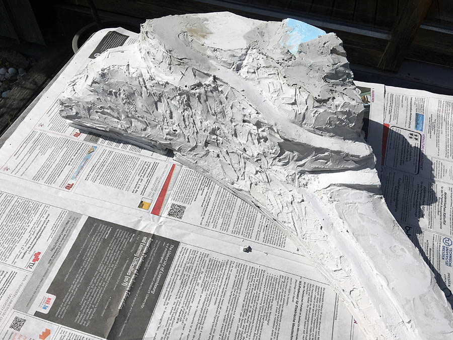 Im rechten Anlagewinkel sind die Schrebergärten nun fertiggestellt. Dahinter hat bisher noch eine Lücke geklafft. Neben der Schmalspurtrasse soll hier ein Felsen enstehen, der von einer mittelalterlichen Burgruine gekrönt wird.